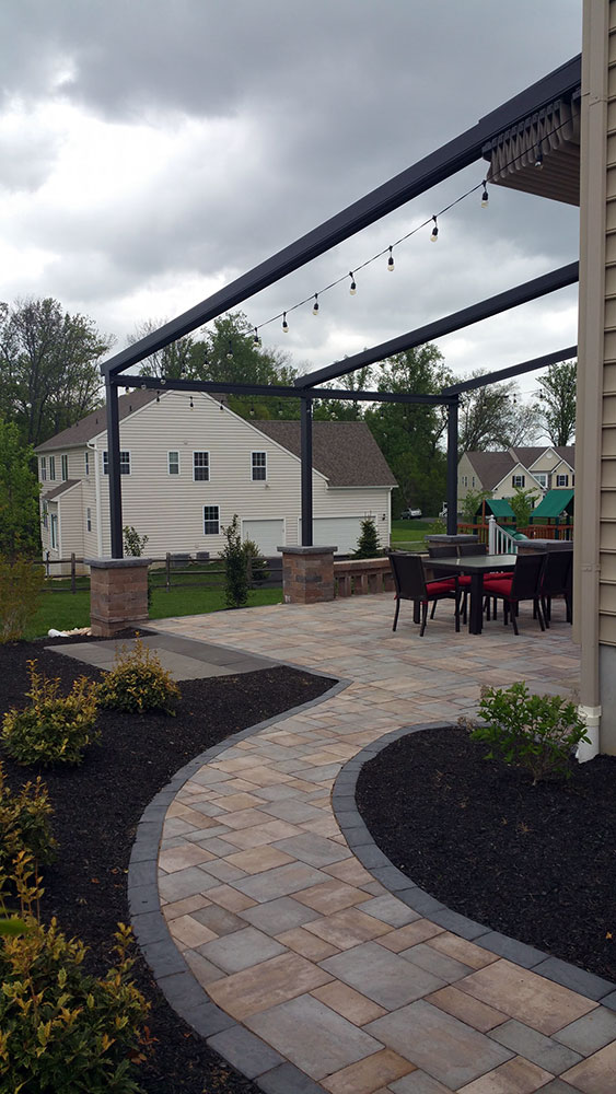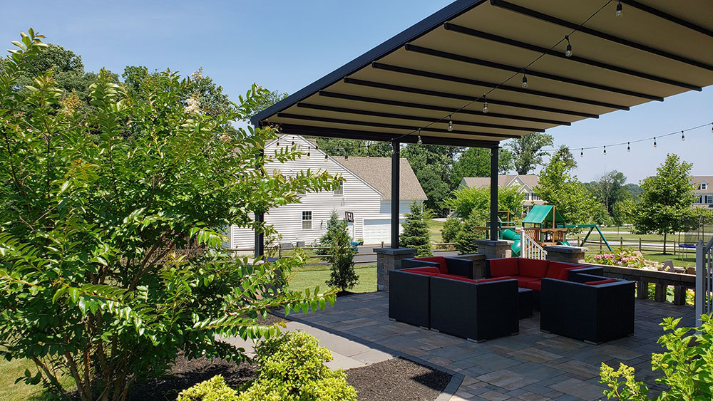 We recently designed & built this GENNIUS patio in Downingtown, PA. At the push of a button, the awning retracts for light and view. For this project, we integrated the stone columns and GENNIUS columns.
